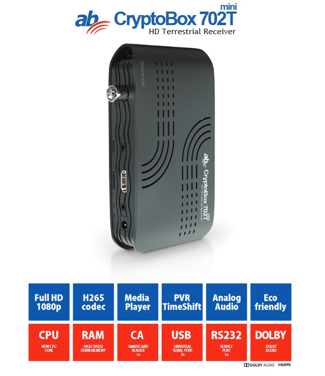 AB CryptoBox 702T MINI to połączenie cyfrowego odbiornika naziemnego DVB-T2 oraz odtwarzacza multimedialnego o rozdzielczości 1080p Full HD.