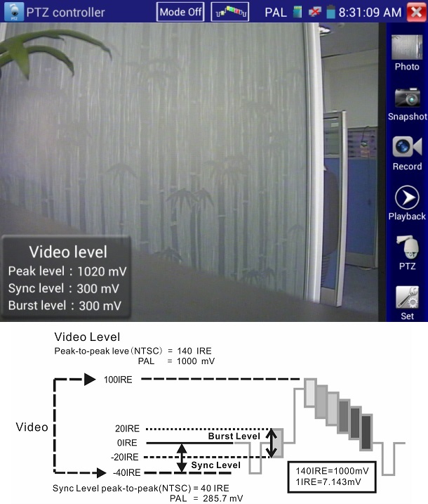 Miernik poziomu wideo: | poziom sygnału wideo PEAK, poziom sygnału SYNC, pomiar poziomu chrominancji COLOR BURST |