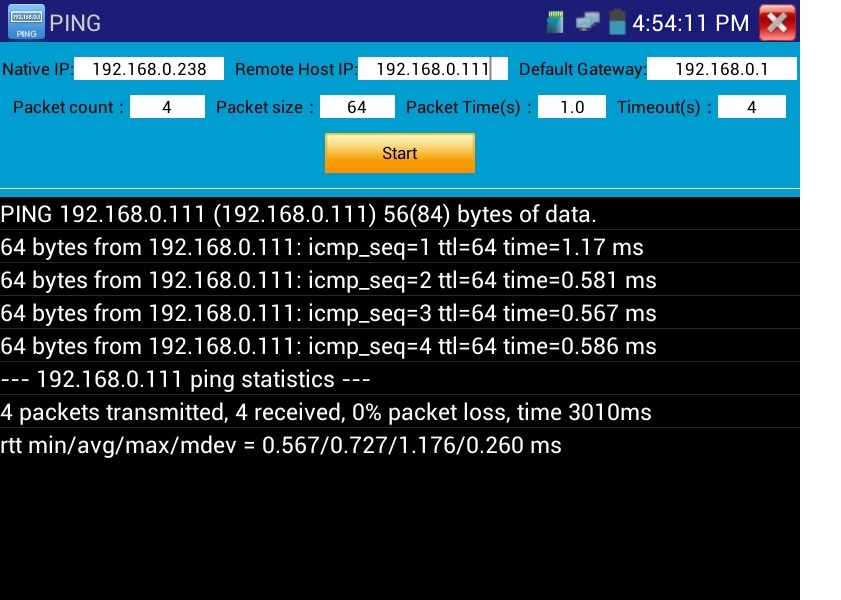 Badanie PING-u - narzędzie debugowania sieci, używane do badania podłączenej np.: kamery IP lub inne urządzenie sieciowego do portu Ethernet, czy działa normalnie lub czy adres IP jest poprawny. Możemy także sprawdzić: liczbe pakietów, rozmiar pakietów oraz czas.