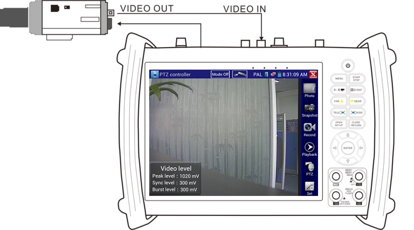 Możemy także swobodnie działać na monitoringu analogowym łącznie z obsługa kamer PTZ. Wystarczy kamery podłączyć pod gnizada BNC, a urządzenie samo dostosuje format obrazu. Dzięki obsłudze kamer analogowych i PTZ możemy ustawić: kontrast, kolor, nasycnie, czułość, sprawdzić i ustawić ścieżki obrotu kamer PTZ. SP-IPL07AiO4K posiada wyjście zasilające DC12V/2A co umożliwia nam zasilanie kamer bezpośrdnio z miernika.