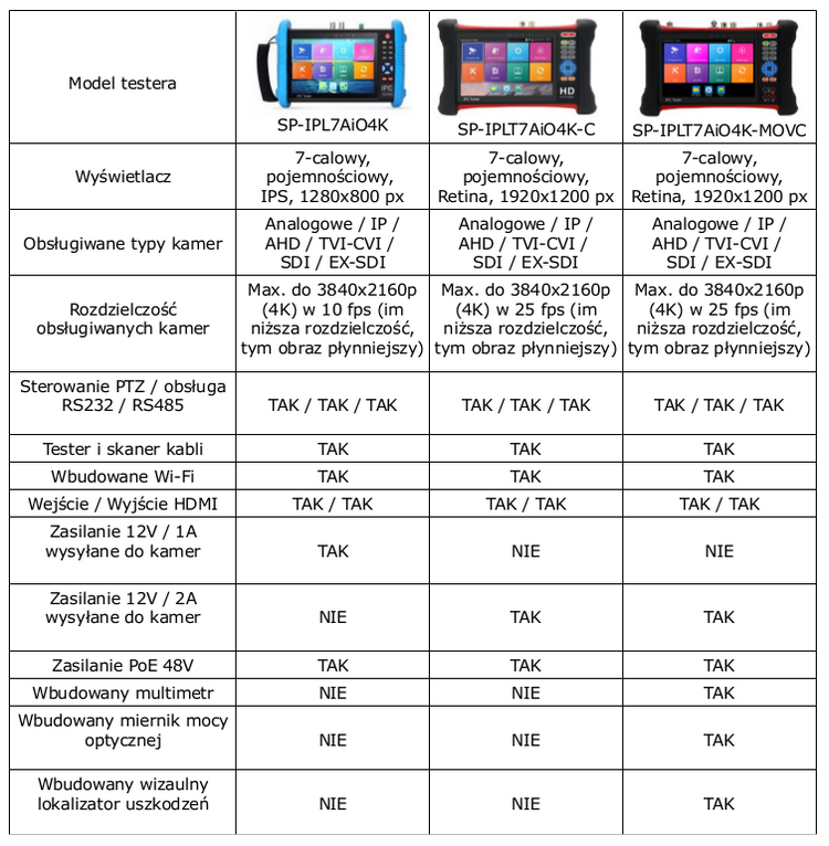 Miernik ten obsługuje najnowszą kompresję obrazu H.265, oraz został wyposażony w ekran umożliwiający podgląd obrazu o rozdzielczości do 4K UHD, aby zapewnić jeszcze wyższą jakość i dokłądność pracy. Jest to najnowocześniejsze urządzenie dostępne na rynku dla instalatorów i konserwatorów systemów monitoringu, ale także dla instalatorów sieci Ethernet. Został on robudowany o wiele funkcji, obsługujące sieci internetowe takie jak: skanowanie adresów IP, test PING, testowanie kabla LAN i wiele innych. Jego solidna obudowa zakończona na rogach gumową osłoną, chroni go przed ewentualnym upadkiem. Każdy instalotor sieci oraz monitoringu znajdzie w mierniku Spacetronik SP-IPL07AiO4K, niezbędne i podstawowe funkcje w tym małym i łatwym do przenoszenia urządzeniu. Dzięki dodatkowemu wejściu HDMI, istnieje możliwość podłączenia do miernika np. komputera, odtwarzacza multimediów, rejestratora.