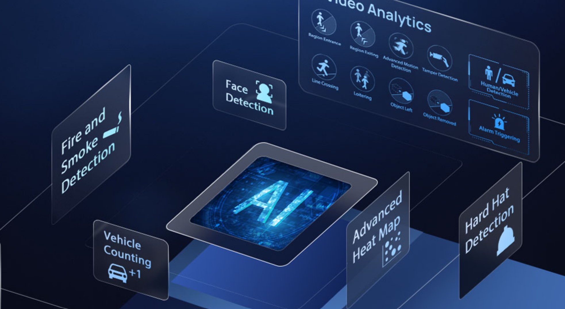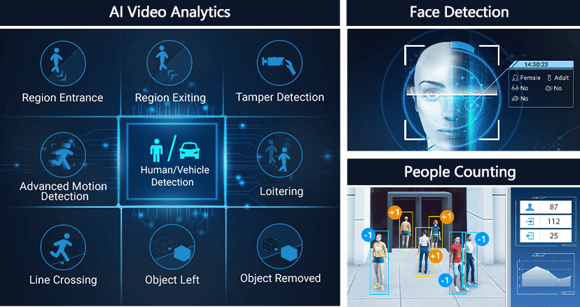 - Videoanalyse - Eintritt in den Bereich, Austritt aus dem Bereich, erweiterte Bewegungserkennung, Manipulationserkennung, Überschreiten der Linie, Herumlungern, Verlassen des Objekts, Entfernen des Objekts