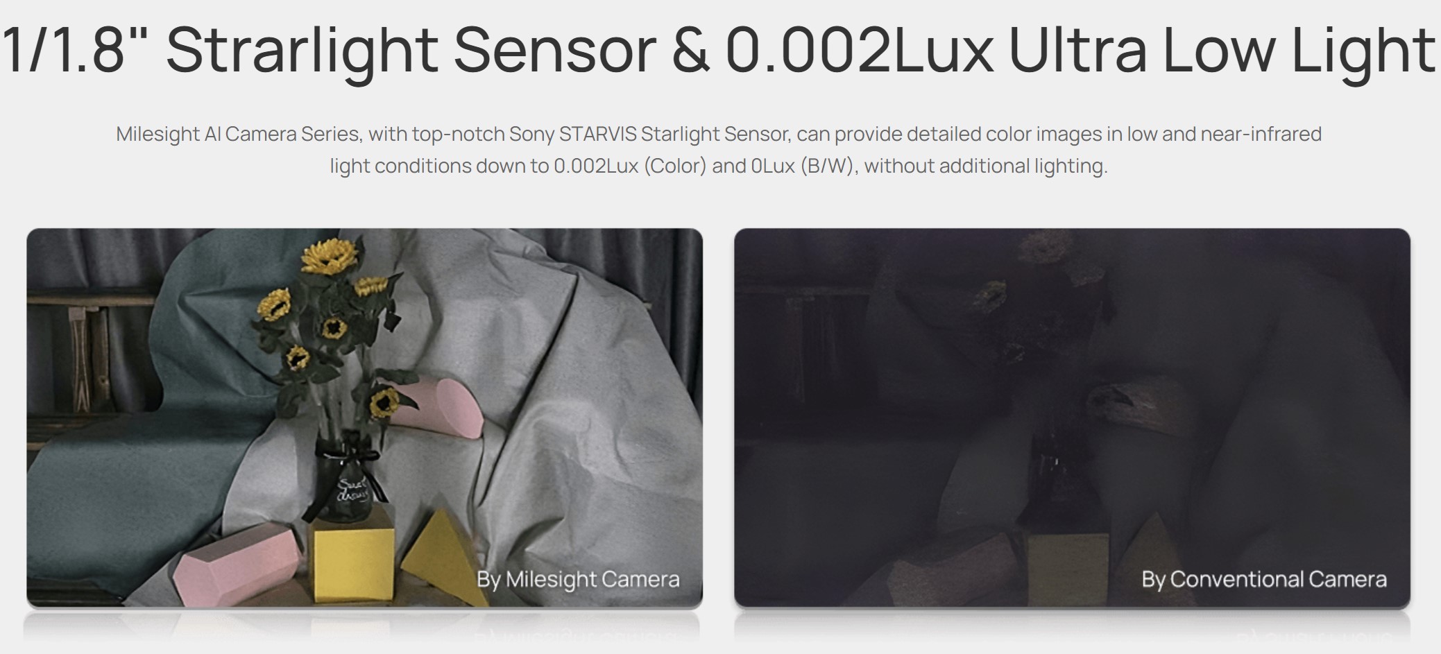 Die Kameras der Milesight AI-Serie mit dem STARVIS Starlight-Sensor der Spitzenklasse von Sony liefern detaillierte Farbbilder bei schwachem Licht und im Nahinfrarotbereich bis zu 0,002 Lux (Farbe) und 0 Lux (Schwarzweiß) ohne zusätzliche Beleuchtung.