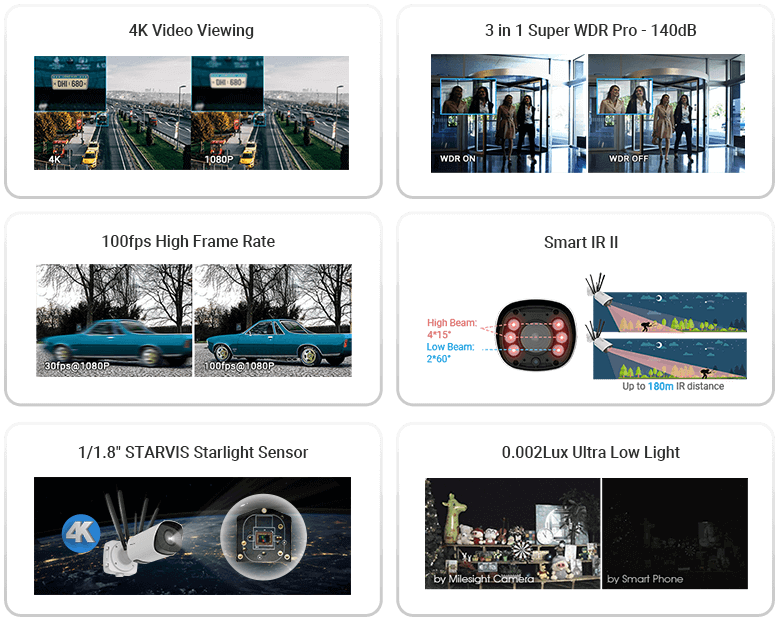 Milesight verwendet den hochempfindlichen 1/1,8-Zoll-Sensor von Sony, der etwa doppelt so viel Kapazität wie herkömmliche Sensoren hat. Seine hohe Empfindlichkeit ist so ausgelegt, dass selbst bei völliger Dunkelheit satte und scharfe Bilder aufgenommen werden. Die Milesight 5G Pro Bullet Plus Kamera ist eine Kombination aus 3-in-1 Super WDR Pro, einer Bildrate von 100 fps und 4K-Videofähigkeit, die trotz schneller Bewegungen ultrahochauflösende Bilder ohne Verzögerung liefert.
