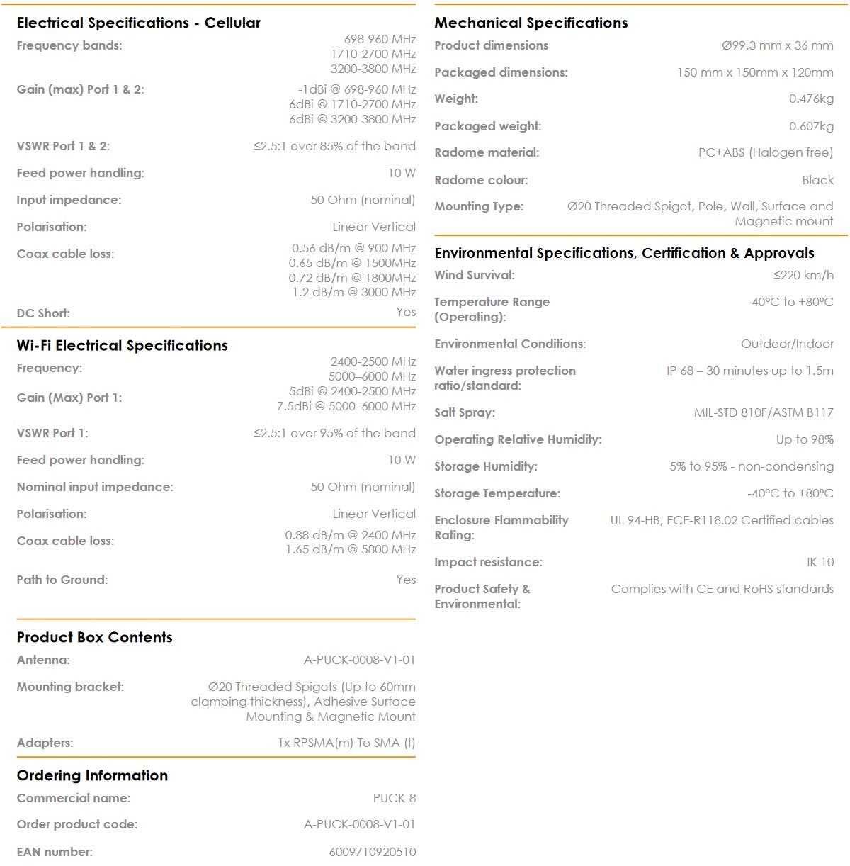 Die neue PUCK-Serie von Poynting bietet Antennen mit kleinem Profil für den Einsatz in den Bereichen IoT/M2M, intelligente Zähler, intelligente Versorgungseinrichtungen, Transport, Schifffahrt und Landwirtschaft. Die PUCK-8 besteht aus einem 3-in-1-Antennensystem in einem einzigen Gehäuse, das 2×2 MIMO LTE und Wi-Fi (Dual-Band 2,4 GHz und 5 GHz) bietet. Die 2×2 Cellular MIMO-Antennen (für 2G / 3G / 4G) unterstützen den Frequenzbereich von 698 MHz bis 3800 MHz, einschließlich der beliebtesten internationalen LTE-Bänder. Die Antenne bietet eine Dualband-Wi-Fi-Antenne, die gleichzeitig 2,4- und 5-GHz-Bänder bietet und 802.11ni 802.11ac / ax unterstützt. PUCK übertrifft die Leistung vieler Mitbewerber aufgrund der Aufmerksamkeit, die dem Design dieser Hochleistungsantenne gewidmet wurde. Die Strahlungsdiagramme aller strahlenden Elemente bieten eine hervorragende Balance zwischen Rundstrahlcharakteristik, Diversität der Diagramme und guten Strahlungseigenschaften in der gewünschten Höhe, was bei Antennen von so geringer Größe oft übersehen wird. Trotz ihrer geringen Größe bietet diese Antenne eine hervorragende Leistung, insbesondere in den höheren Frequenzbändern, wo die Leistung für den LTE-Durchsatz und die Verbindungsstabilität entscheidend ist. Diese Antenne ist so konzipiert, dass beide LTE-Ports mit dem Router/Gerät verbunden sind, um die beste Leistung zu gewährleisten. Sehen Sie sich andere Derivate der PUCK-Serie an, die sich besser für SISO-Anwendungen eignen.