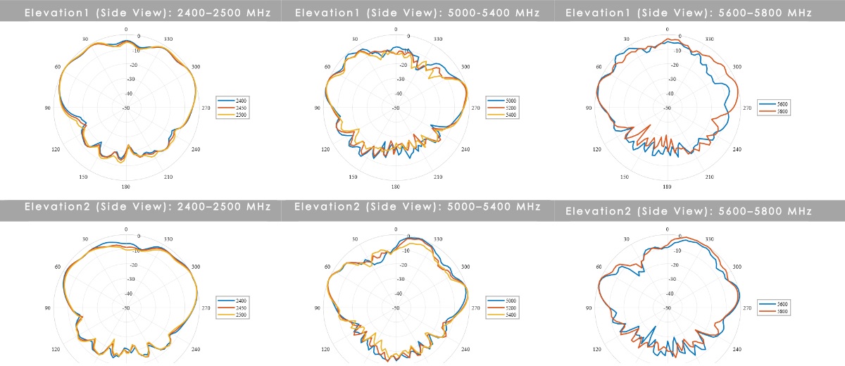 6dBi ist die Spitzenverstärkung in allen Bändern von 698-960, 1710-2700 und 3400-3800 MHz 7,5 dBi ist die Spitzenverstärkung in allen Bändern 2400-2500 und 5000-5800 MHz