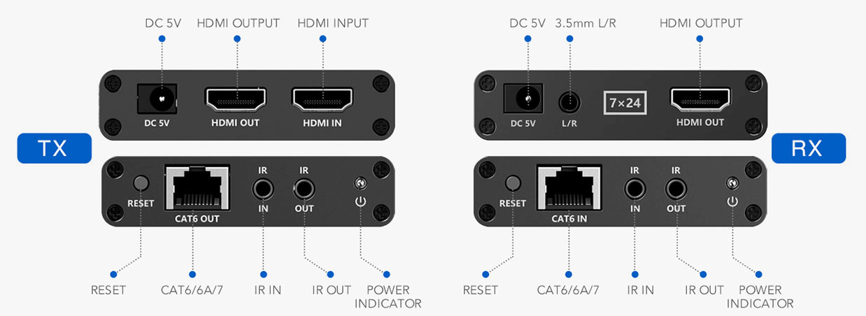 Über HDMI können Geräte an den Sender angeschlossen werden - z.B. Kameras, PCs, DVDs, TV-Boxen, Computer etc. Über einen zusätzlichen HDMI-Ausgang kann ein Monitor direkt an den Sender angeschlossen werden. Das Hauptsignal wird über ein CAT6/6A/7 Kabel über eine Entfernung von bis zu 70m an den Empfänger gesendet.