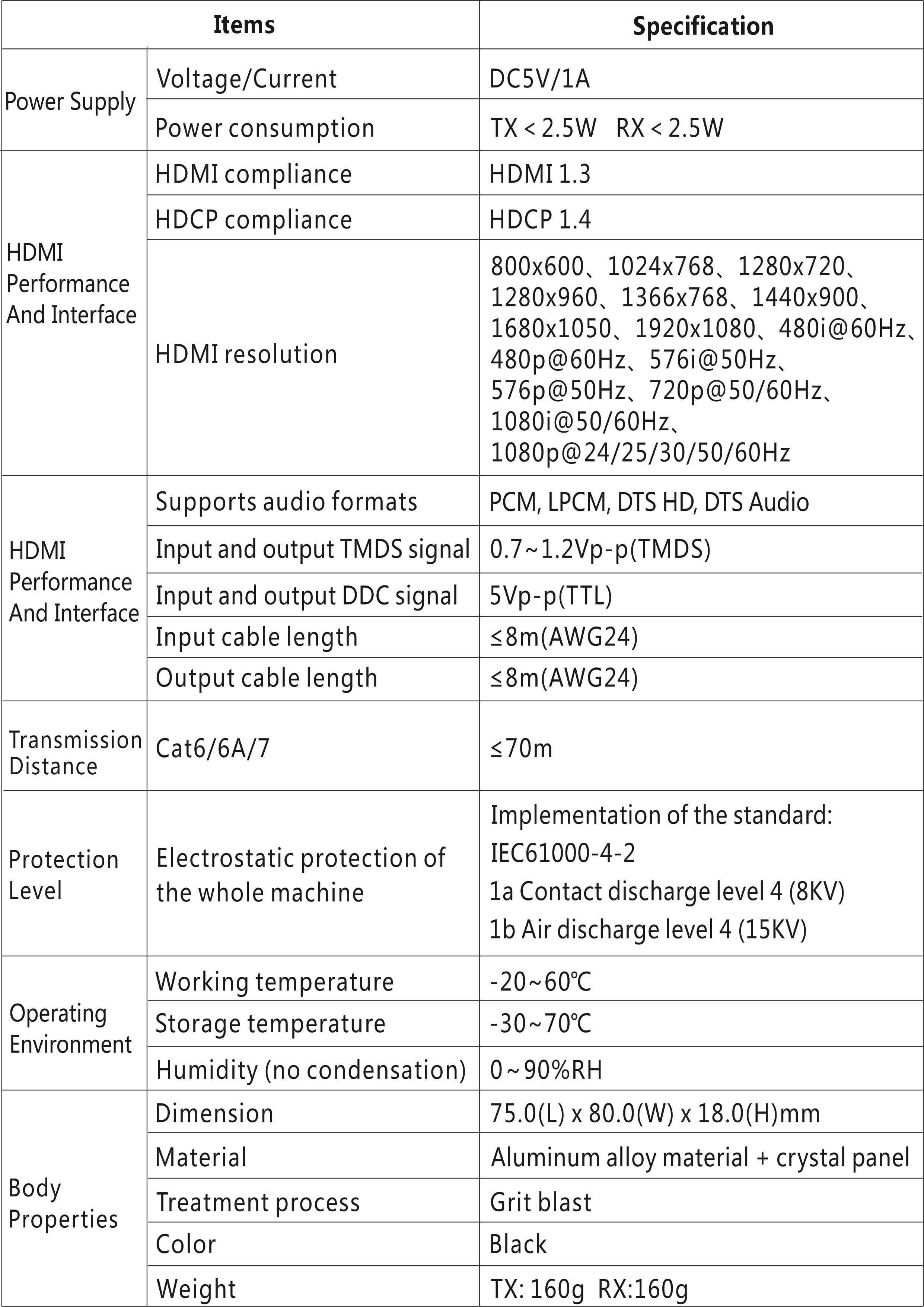 Der HDMI Extender ermöglicht die Übertragung und Verlängerung eines unkomprimierten HDMI Full HD 1080P @ 60Hz Signals über CAT6 / 6A / 7 Netzwerkkabel, die Übertragungsdistanz beträgt bis zu 70 Meter bei 1080P Auflösung mit null Latenz. Das Kit enthält eine Sendeeinheit (TX) und eine Empfangseinheit (RX), die als Paar arbeiten. Die Einheit unterstützt bidirektionale IR-Signale.