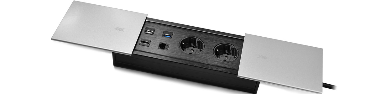 Mediaport Die Spacetronik ERGOLINE SPS-S26S V2 ist eine hochmoderne Lösung, die ihren Platz in vielen Bereichen findet. Sie wird in Geschäften, Ausstellungsräumen, Konferenzräumen, Büros und auch zu Hause eingesetzt. als auch im privaten Bereich. Sie ist aus Aluminium und hochwertigen Komponenten gefertigt. Das Produkt ist für die Innenmontage in Schreibtischen, Arbeitsplatten und Tischen konzipiert, sowohl vertikal als auch horizontal, wobei der Zugang zu den Steckdosen gewährleistet ist. Zusätzlich zu den Standard-Steckdosen (Schuko) verfügt es auch über USB 3.0- und USB 2.0-Anschlüsse, HDMI und eine RJ-45-Ethernet-Buchse, die alle durch zwei verschiebbare Aluminiumabdeckungen.