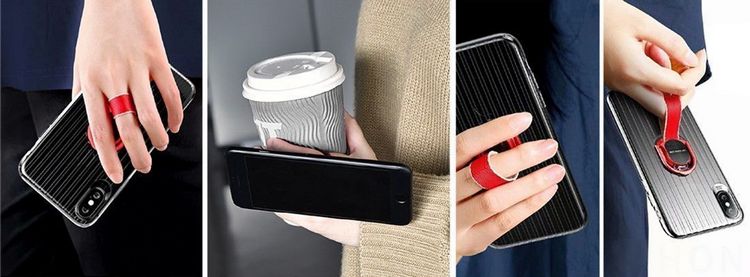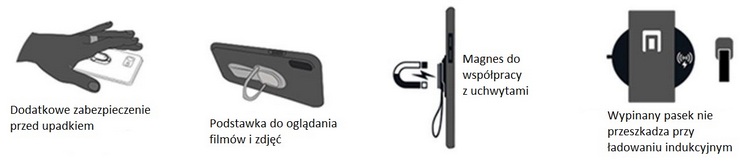 Sam pasek na palec pełni nie tylko rolę dodatkowego punktu chwytu, ale także dzięki metalowemu elementowi można użyć go jako podstawki przy oglądaniu zdjęć lub filmów. To jednak nie wszystko, uchwyt dla smartfona posiada również magnes i jest zgodny z uchwytami magnetycznymi, np. w samochodach, nie utrudnia też ładowania indukcyjnego.