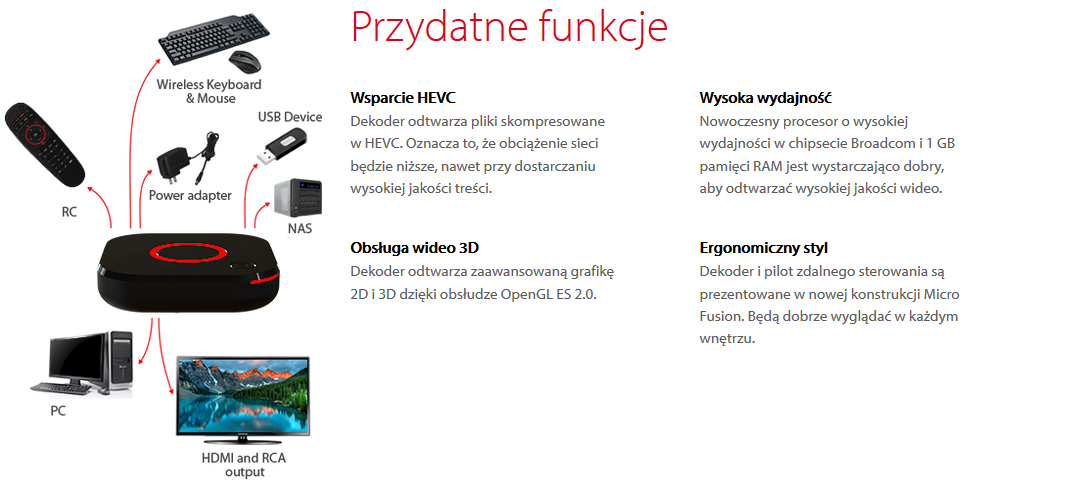 Urządzenie STB odtwarza pliki skompresowane HEVC. Oznacza to, że obciążenie sieci będzie niższe, nawet przy dostarczaniu treści wysokiej jakości.