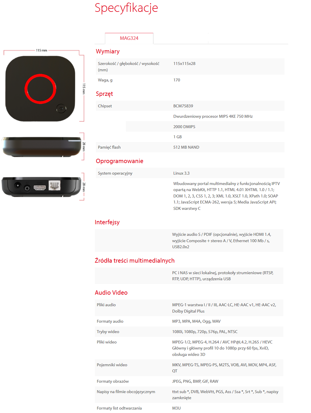 Ekonomiczne rozwiązanie dla odbioru telewziji IPTV / OTT z pełnym zestawem funkcji. MAG324 to podstawowy dekoder na chipsecie Broadcom, który obsługuje kompresję HEVC H.265. Dlatego urządzenie działa szybko i przy minimalnym obciążeniu sieci. Dzięki wyjściu HDMI 1.4b możesz cieszyć się wysokiej jakości wideo. Całkowicie zmieniliśmy również obudowę i konstrukcję pilota, dzięki czemu jest bardziej ergonomiczny i łatwiejszy w użyciu.BCM75839, Linux 3.3, OpenGL ES 2.0, HEVC, 512 MB Flash / 1 GB RAM
