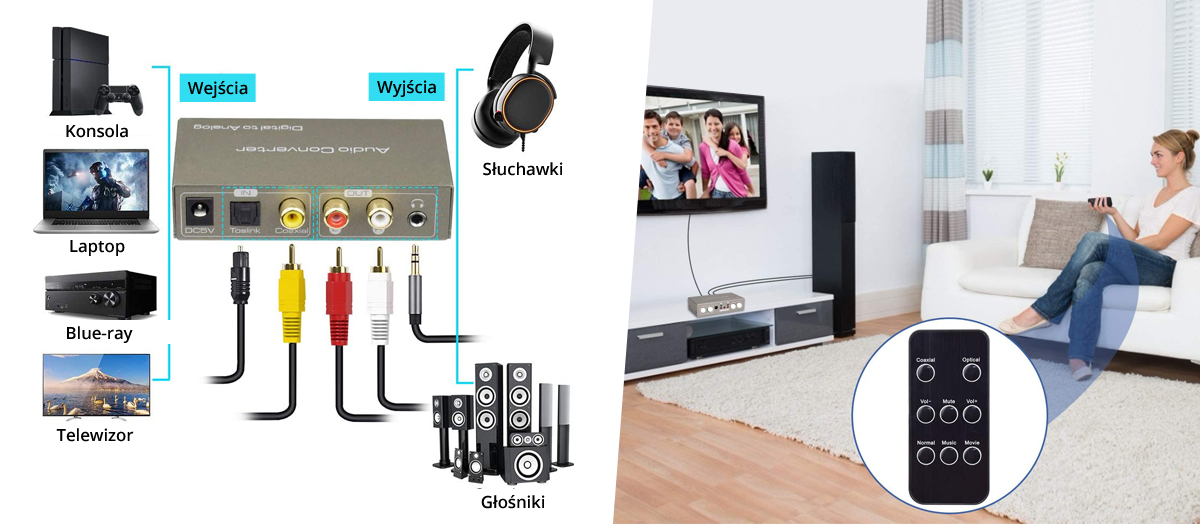 1. Konwertuje sygnał koncentryczny i Toslink na analogowe audio L / R oraz Jack 3,5mm