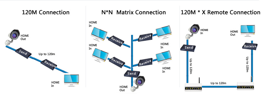 Konwenter HDMI Extender Matrix zapewnia niezawodną transmisję sygnału HDMI na pojedynczym przewodzie sieciowym CAT5/6 z dodatkową funkcją przedłużacza pilota, która wspiera protokół IGMP, Obsługuje protokoły TCP / IP, łatwy i prosty do budowy w macierzystej sieci wideo z dobrą stabilnością przeciwzakłóceń capabilith.