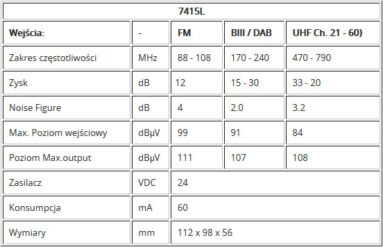 - regulacja wzmocnienia w BIII / DAB 15-30dB