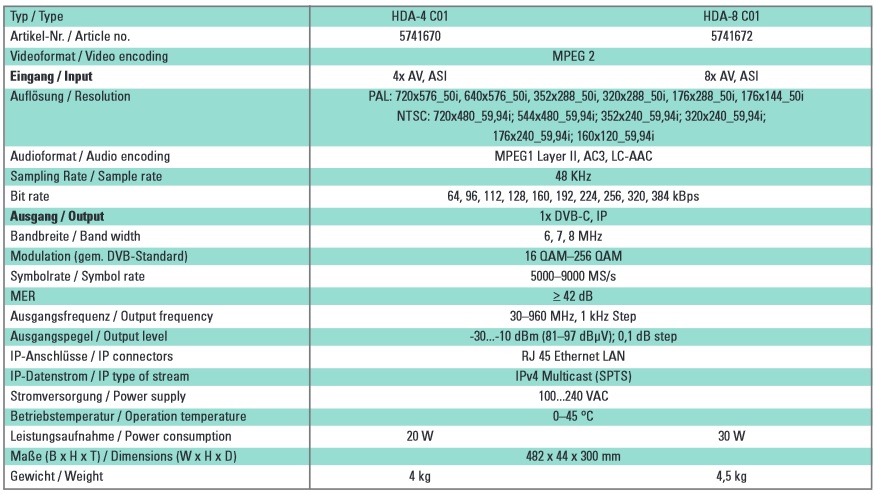 Modulator sygnału AV na standard DVB-C. Sygnał jest również dostępny jako strumień IP i może być wprowadzany do sieci IPTV.Sygnał ASI jest dostępny do dalszej obróbki na dwóch wyjść.Używany jest format wideo MPEG-4 lub alternatywnie MPEG 2. Urządzenie ma szeroki zakres użyteczny i może obsługiwać sygnały AV z dekoderów, PC / notebooków, kamer, odtwarzaczy DVD.