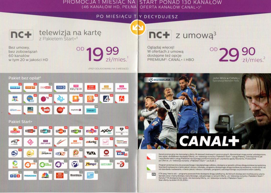 - pozostanie w ofercie "NC+ telewizja na kartę z pakietem Start+" z dostępem do 60-u kanałów w tym 20-u w jakości HD, na zasadach pre-paid (bez zobowiązań) w cenie od 19,99 zł/msc (przy jednorazowym doładowaniu na trzy miesiące);