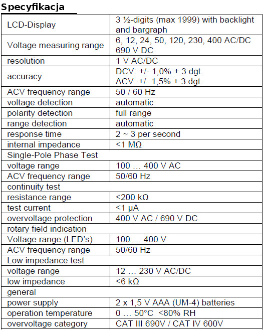 Miernik służący do pomiarów i testowania napięcia prądu w obwodzie elektrycznym z detektor napięcia 2-biegunowego. Stopień ochrony IP 64. Pomiar napięcia AC 6V - 690V. Odporny na uderzenia, kurz i wodę.