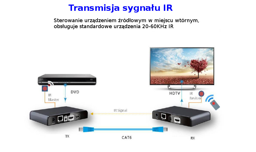 Dodatkową zaletą urządzenia jest przesyłanie funkcji pilota za pomocą dołączonych podczerwieni IR.