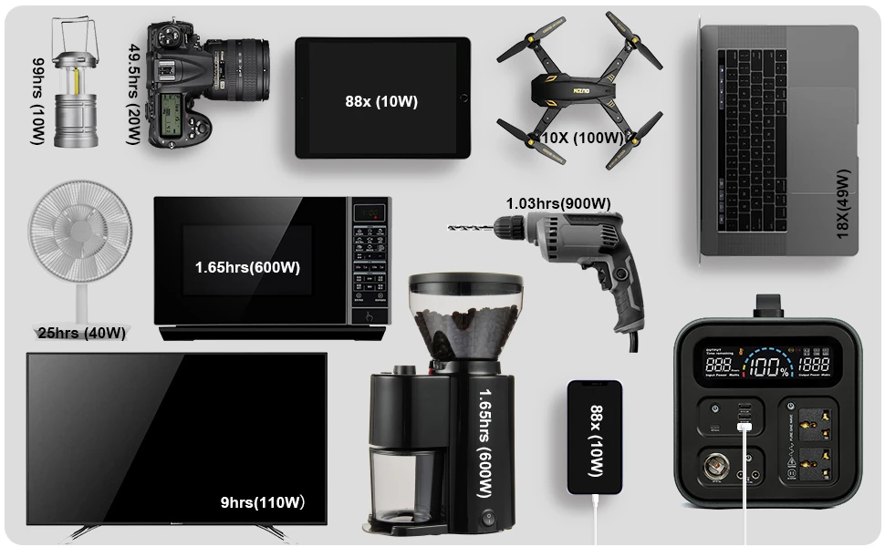 Wróćmy do najmocniejszego i najbardziej pojemnego modelu FlashFish UA1100 który posiada aż 1100Wh 297600mAh mocy. Może zasilać urządzenia w sposób ciągły o konsumpcji 1200W, a chwilowo nawet 2000W. Przy czym nadal pozostaje mobilnym urządzeniem o wymiarach 19,2cm x 30,3cm x 19,2cm. Przykładem dla tego urządzenia może być używanie dowolnego sprzętu o mocy 900W (wiertarka, suszarka do włosów) przez 1,03h, telewizora o konsumpcji 110W przez 9h, mikrofalówki 600W przez okres 1,65h. To jest oczywiście tylko przykład, a zastosowań jest o wiele więcej. Przykładowy sprzęt i ilość ładowań czy też długość pracy przy pomocy magazynu energii prezentujemy na grafice poniżej.