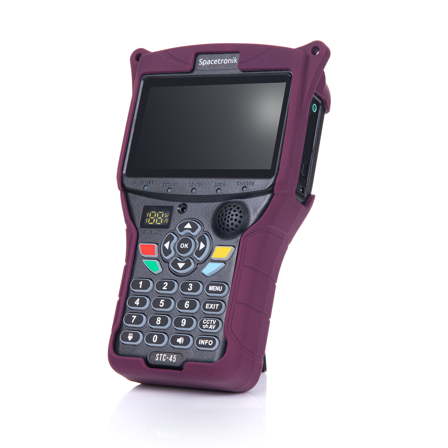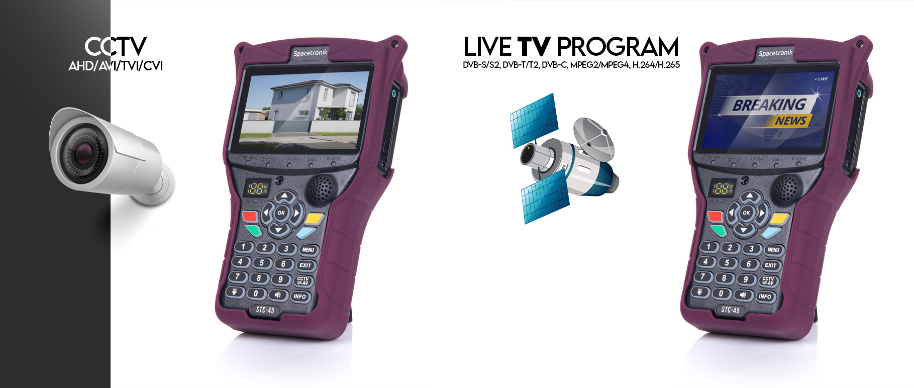Miernik Spacetronik STC-45 COMBO jest urządzeniem najdokładniejszym do wykonywania pomiarów sygnałów telewizji satelitarnej DVB-S/S2, anten telewizji naziemnej DVB-T/T2 oraz sygnału telewizji kablowej DVB-C, co pozwala na precyzyjne ustawianie anten. Pomiar sygnału siły i jakości w %, funkcję pomiarowe BER, PWR, SNR oraz analizatora widma. Podgląd kanałów TV na żywo. Miernik dzięki funkcji podglądu obrazu z kamer analogowego oraz cyfrowego AHD sprawdzi się także w ustawianiu kamer monitoringu CCTV.