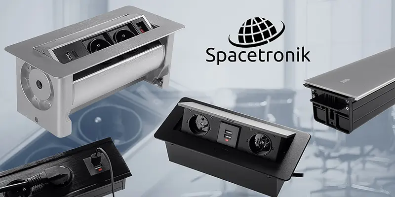 Gniazdka meblowe Spacetronik cechuje swoboda i prostota użytkowania, ale także łatwość montażu. W zależności od tego, czy kupimy gniazdo wpuszczane, podblatowe czy nablatowe montaż będzie się różnił. Najłatwiejsze do zamontowania są gniazda nablatowe — za pomocą załączonego do produktu zacisku w kilka sekund umieścimy mediaport w wybranym miejscu. Plusem tego rozwiązania jest brak otworów w blacie, jednakże zajmuje nieco więcej miejsca przez to, że jest umieszczony w przestrzeni roboczej biurka. W przypadku gniazda podblatowego należy je przykręcić od dołu blatu. Jest to najlepszy sposób na to, aby mediaport dobrze się trzymał i oczywiście nie uległ grawitacji. Wkręty do montażu są dołączone do produktu. Gniazda wblatowe, jak nazwa wskazuje, są montowane w blacie. Oznacza to, że musimy przed montażem wyciąć otwór wielkości gniazda, aby je tam umieścić. Jest to najbardziej pracochłonny ze esposobów montażu naszych gniazd, lecz warto wykonać tę nietrudną czynność. Gniazdo blatowe jest dodatkowo przykręcone. Sprawia to, że jest ono stabilnie zamontowane, a dodatkowo ma największe walory estetyczne i najmniej zajmuje miejsca — stanowi po prostu integralną część blatu.
