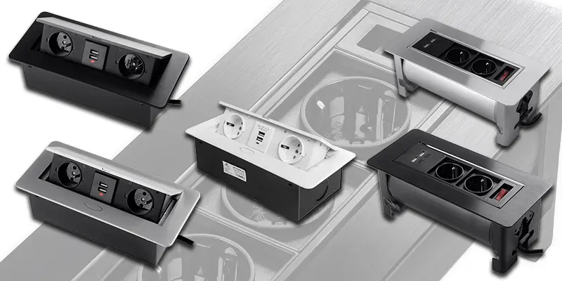 Wpuszczane gniazda meblowe są montowane w blacie. Gniazda tego rodzaju można wybrać w wersji obrotowej, rozsuwanej, otwieranej, wysuwanej lub odkrytej.