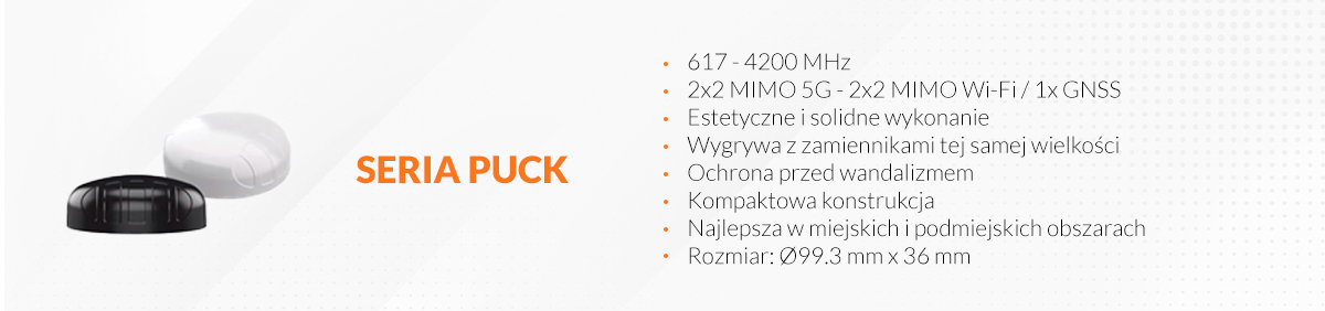 Seria anten oferuje szerokie pasmo pracy od 617 do 4200 MHz. Wyposażona jest w konfigurację 2x2 MIMO 5G, 2x2 MIMO Wi-Fi i 1x GNSS, co zapewnia wszechstronne możliwości komunikacji. Anteny PUCK charakteryzują się niewielkim rozmiarem, co oznacza, że mogą być dyskretnie zamontowane w różnych miejscach. Pomimo swojego kompaktowego rozmiaru o średnicy 99,3 mm i wysokości 36 mm, anteny PUCK wygrywają z innymi antenami o podobnej wielkości, oferując wyższą jakość i lepszą wydajność.