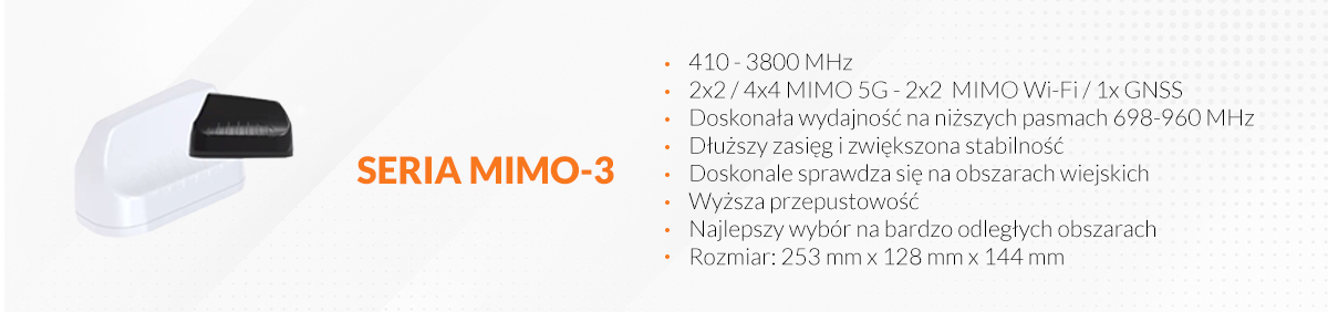 W porównaniu do innych anten o podobnych rozmiarach, anteny MIMO 3 wyróżniają się większymi gabarytami, o wymiarach 253 mm x 128 mm x 144 mm. Jednak ta solidna konstrukcja zapewnia wytrzymałość i długotrwałą niezawodność, co jest szczególnie istotne w trudnych warunkach zewnętrznych.