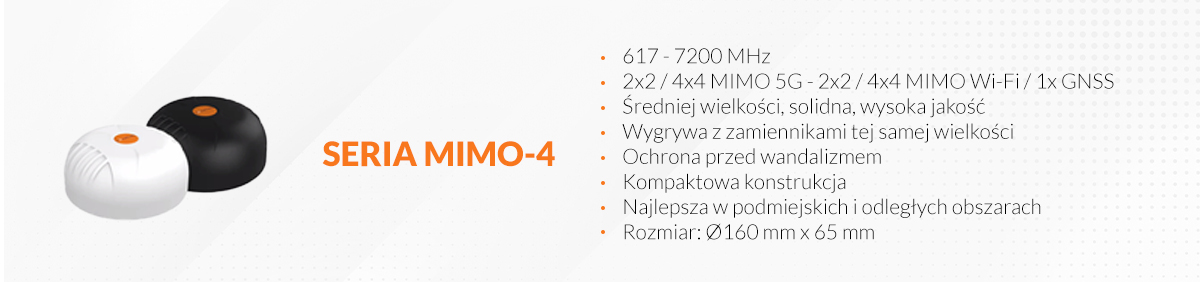 Przechodząc do serii anten MIMO 4, mamy do czynienia z zakresem częstotliwości od 617 do 7200 MHz. Seria ta oferuje zarówno konfigurację 2x2, jak i 4x4 MIMO dla 5G, Wi-Fi oraz 1x GNSS, co daje duże możliwości wyboru odpowiedniego rozwiązania. Anteny MIMO 4 mają średniej wielkości konstrukcję, która zapewnia solidność i wysoką jakość wykonania.