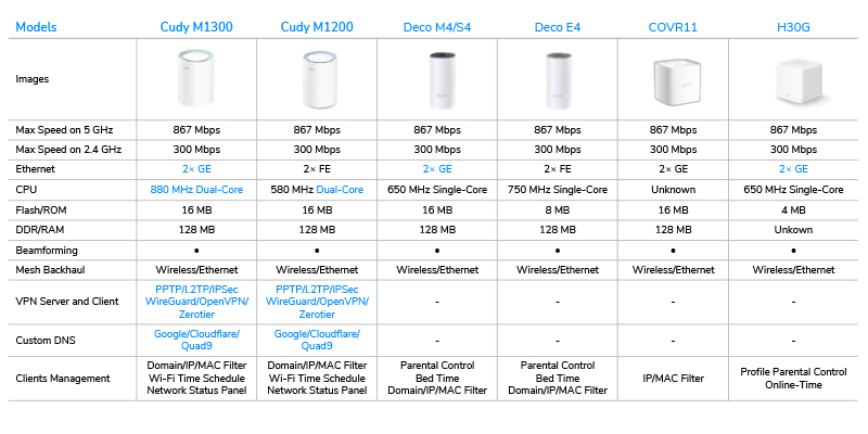 Router WiFi Mesh Cudy M1200 WiFi AC1200 Dual Band WiFi 5 oraz Router WiFi Mesh M1300 WiFi AC1200 Dual Band 1Gbps LAN WiFi 5 vs. TP-Link Deco M4/S4, TP-Link Deco E4, D-LINK COBR11, Mercusys H30G