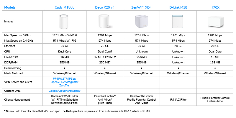 Router Mesh Cudy M1800 WiFi AX1800 Dual Band WiFi 6 vs. TP-Link Deco X20 v4, ASUS ZenWiFi XD4, D-Link M18, Mercusys H70X