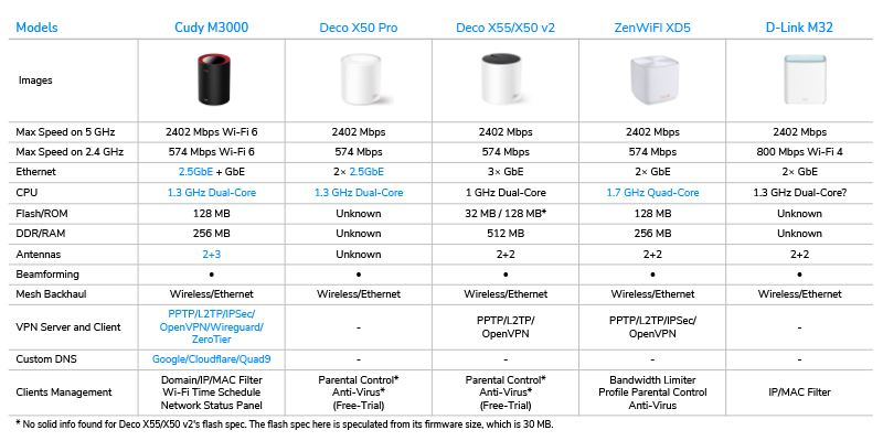 Router Mesh Cudy M3000 AX3000 2.5G Wi-Fi 6 Mesh System vs. TP-Link Deco X55/X50 v2, TP-Link Deco X50 Pro, ASUS ZenWifi XD5 i D-LINK M32