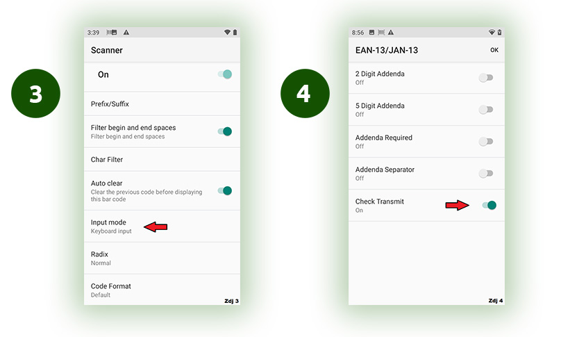 W ustawieniach skanera należy wybrać formę wprowadzania Keyboard input (Zdj 3) oraz w Advanced settings ustawić Check Transmit na On dla opcji EAN-13/JAN-13. (Zdj 4)