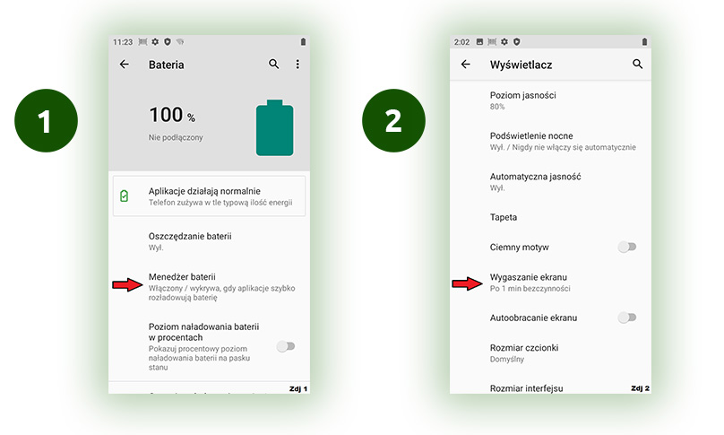 Dla optymalnej pracy skanera zaleca się wyłączenie wygaszania ekranu urządzenia (Zdj 1) oraz managera baterii. (Zdj 2)