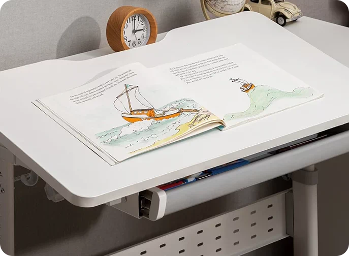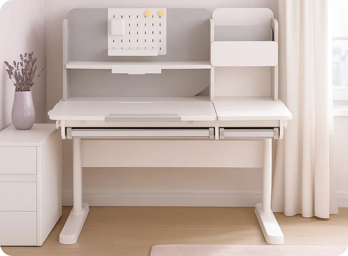Praktyczne biurko dla dziecka to nie tylko regulacja, ale i dobrze rozplanowana przestrzeń do przechowywania. Wbudowane szuflady i półki pomagają utrzymać porządek: zeszyty, przybory szkolne i książki są zawsze pod ręką, a blat wolny od zbędnych przedmiotów. Stabilne prowadnice gwarantują płynne wysuwanie szuflad, a otwarty system przechowywania pozwala na szybki dostęp do najważniejszych rzeczy podczas pracy czy kreatywnych zajęć plastycznych.