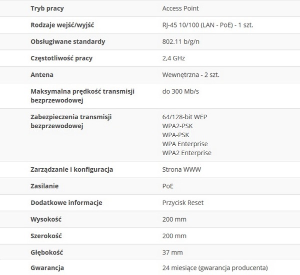 Karta katalogowa ze specyfikacją dostępna pod linkiem: https://s.spacetronik.pl/zdjecia_DMTRADE/katalogi/ubiquiti/uap/uap-przewodnik.pdf