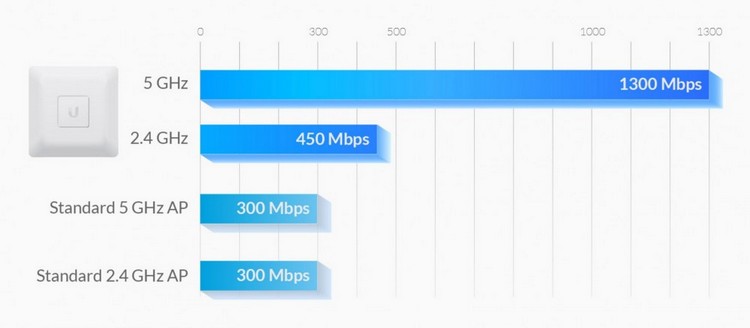 UniFi UAP-AC obsługuje 802.11 ac i prędkość do 1300 Mbps w paśmie radiowym 5 GHz oraz do 450 Mbps w paśmie radiowym 2,4 GHz. Model pozwala jednak na coś więcej. UAP-AC to pewność obsługi dwóch pasm jednocześnie w technologii 3x3 MIMO dla każdego pasma. Dodatkowo posiada domowy ultra długi zasięg 802.11n 300Mbps WIFI-AP, ułatwia śledzenie wpisów i ostatnich wydarzeń w sieci, pozwala na kontrolę i dostęp do poszczególnych użytkowników podłączonych do sieci.Zastosowanie