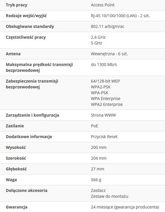 Karta katalogowa ze specyfikacją dostępna pod linkiem: https://s.spacetronik.pl/zdjecia_DMTRADE/katalogi/ubiquiti/uapac/uapac-przewodnik.pdf
