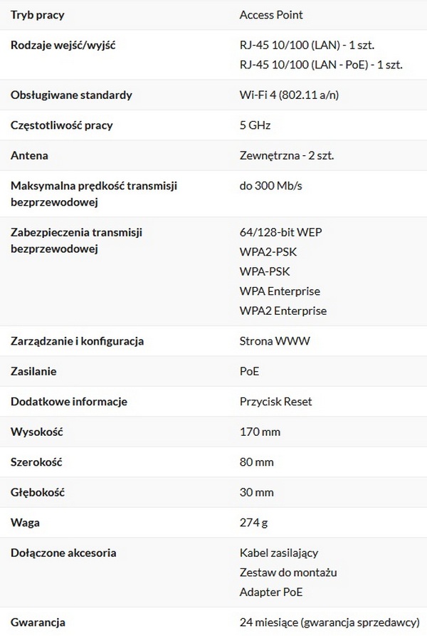 • Zewnętrzny access point lub repeater Ubiquiti UAP-Outdoor-5. Pracuje na paśmie Wi-Fi 5GHz, standard 802.11 a/n do 300Mb/s, zasięg teoretyczny do 183m w terenie otwartym