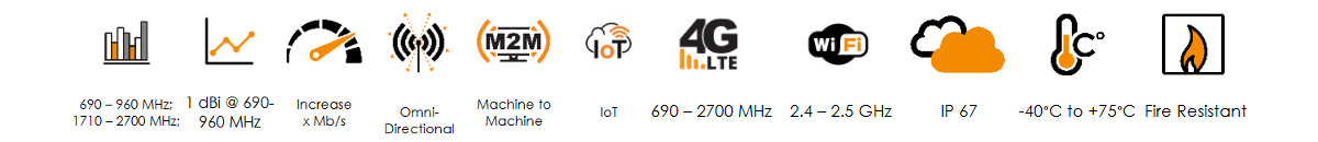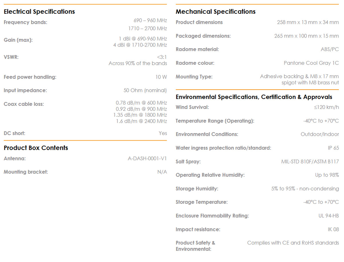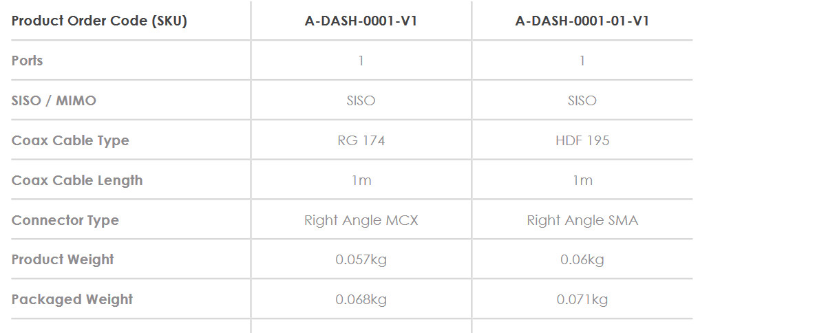 Antena DASH-1 jest celowo zaprojektowana dla wymagań niskoprofilowych, takich jak inteligentne liczniki. Ta antena dookólna jest odpowiednia do użytku wewnątrz i na zewnątrz, zwykle montowana na górze lub z boku inteligentnych liczników. Antena DASH-1 została zaprojektowana z myślą o prostocie instalacji, przy jednoczesnym pokryciu pasm częstotliwości LTE 690–2700 MHz. Ta antena ma doskonałą wydajność elektryczną w całym paśmie 690-2700 MHz LTE / komórkowym.
