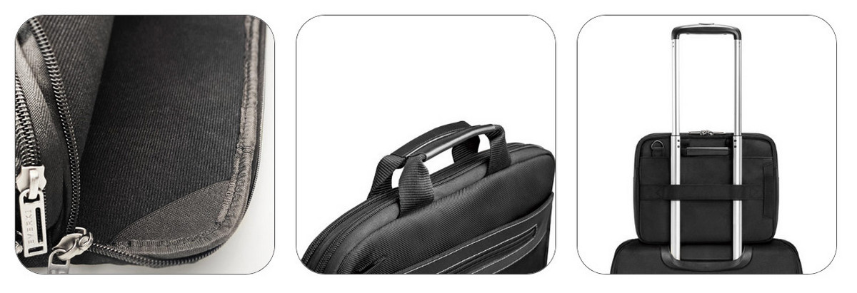 Everki Business pozwala bezpiecznie przechowywać 14,1-calowy laptop w swojej grubościennej, podbitej filcem kieszeni. Sąsiednia kieszeń oferuje kolejną specjalne miejsce dla Kindle / iPad / tablet, obie kieszenie są wyposażone w piankę anti-shock oraz są łatwo dostępne do codziennego użytku lub podczas sprawdzania przez służby ochrony lotniska.