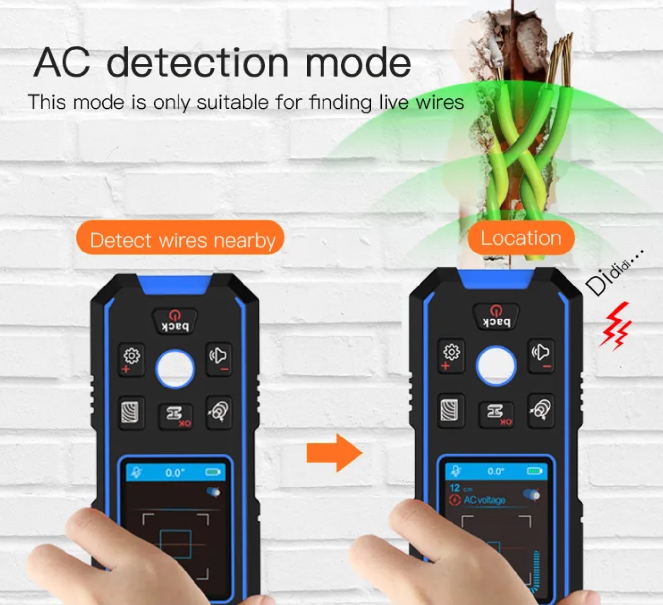 Krótko naciśnij klawisz symbolizujacy przewód, aby wejść w tryb wykrywania AC. Jeśli zostanie znaleziony przewód pod napięciem, na wyświetlaczu pojawi się ikona na żywo oraz siła odbieranego sygnału. Gdy dźwięk jest włączony, zostanie wyemitowany dźwięk „AC”, po którym nastąpi dźwięk „didi”; Konieczne jest wielokrotne wykrywanie zmiany lokalizacji tam iz powrotem, aby określić położenie przewodu pod napięciem. Im bliżej instrumentu znajduje się przewód pod napięciem, tym silniejszy jest sygnał i tym szybszy jest dźwięk „didi”.