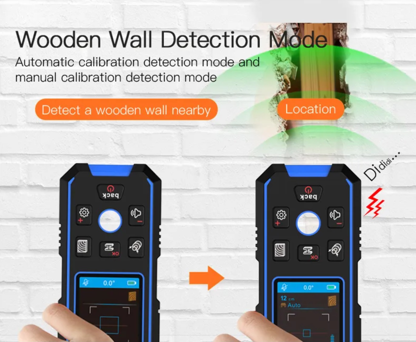 - Funkcja wykrywania: wykrywanie metalu/wykrywanie drewna/wykrywanie zasilania prądem zmiennym.- Pomiar głębokości: drewno: 3,8 cm / przewód pod napięciem (AC): 5 cm / metal niemagnetyczny: 10 cm / metal magnetyczny: 12 cm.