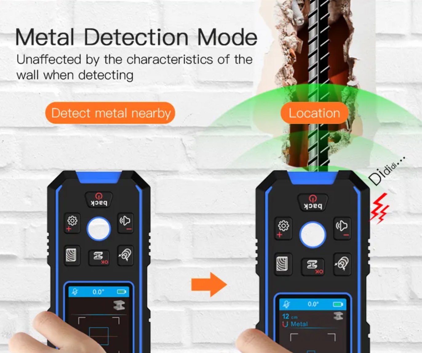 Krótko naciśnij klawisz symbol metalowego profilu, aby przejść do trybu wykrywania metalu; posiada funkcje pozycjonowania metalu, wskazania głębokości i identyfikacji atrybutów metalu. Przyrząd powoli przesuwa się po mierzonym obszarze. Gdy instrument wykryje metal magnetyczny lub metal niemagnetyczny, na ekranie pojawi się symbol „metal” i ikony atrybutów. Wyświetli się siła odbieranego sygnału i informacje o głębokości docelowego metalu z instrumentu. Gdy dźwięk jest włączony, instrument wyda dźwięk „didi” po wyświetleniu komunikatu „metal”. Im bliżej instrumentu znajduje się wykryty metal docelowy, tym silniejszy jest sygnał i tym szybszy jest dźwięk „didi”.