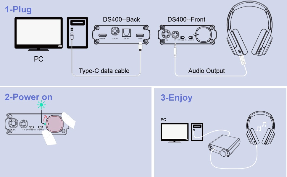 【Łatwo obsługuje słuchawki o niskiej lub wysokiej impedancji】: Dla całkowitej mocy wyjściowej do 140,5 mW przy obciążeniu 32 Ω i do 140,5 mW przy 600 Ω, wzmacniacz biurkowy DS400 może z łatwością obsługiwać dowolne słuchawki o niskiej lub wysokiej impedancji. Przenośny wzmacniacz słuchawkowy DS400 umożliwia płynną regulację głośności w bardzo drobnych krokach bez niepożądanych szumów i nierównowagi kanałów.