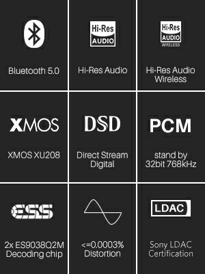 Zastosowany * ES9038Q2M układów ESS i CSR8675 Bluetooth 5.0, odbiornik Lavaudio Bluetooth LDAC HiFi obsługuje dekodowanie dźwięku LDAC i APTX-HD (24 bity / 96 kHz). Po prostu połącz się z Androidem lub iPhone'em przez Bluetooth, aby cieszyć się bezstratną bezprzewodową muzyką w wysokiej rozdzielczości.