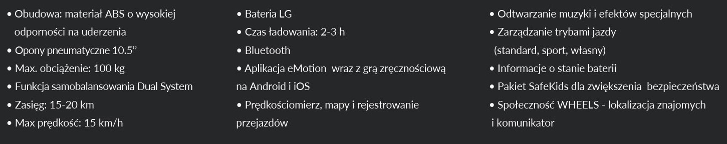 w użyciu dzięki zastosowaniu zaawansowanych technologicznie rozwiązań, zapewniających przemieszczanie się użytkownika oparte na dynamicznych zasad balansowania, obliczaniu położenia środka ciężkości użytkownika za pomocą żyroskopu i czujnika przyspieszenia. Korzystając z najnowszych technologii i procesów produkcyjnych, każdy wheels przechodzi rygorystyczne testy jakości i trwałości. Lekka, przenośna konstrukcja, łatwość użycia, zasięg sprawiają, że wheels jest nowatorskim rozwiązaniem na ekologiczne przemieszczanie.