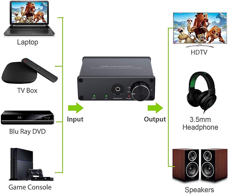 Extractor HDMI na HDMI + Audio R/Lpozwala na podłączenie urządzenia wysyłającego sygnał audio i video (tuner, konsola, dvd, blu-ray) do telewizora kablem HDMI. Dodatkowo można wyodrębnić sygnał audio z urządzenia i przesłać go do amplitunera kina domowego lub innego tego typu urządzenia. Dzięki takiemu rozwiązaniu dźwięk będzie słyszalny standardowo z głośników telewizora i dodatkowo z drugiego źródła po włączeniu amplitunera. Ciekawe rozwiązanie gdy chcemy panować i sami decydować kiedy dźwięk ma być słyszalny z danego urządzenia.