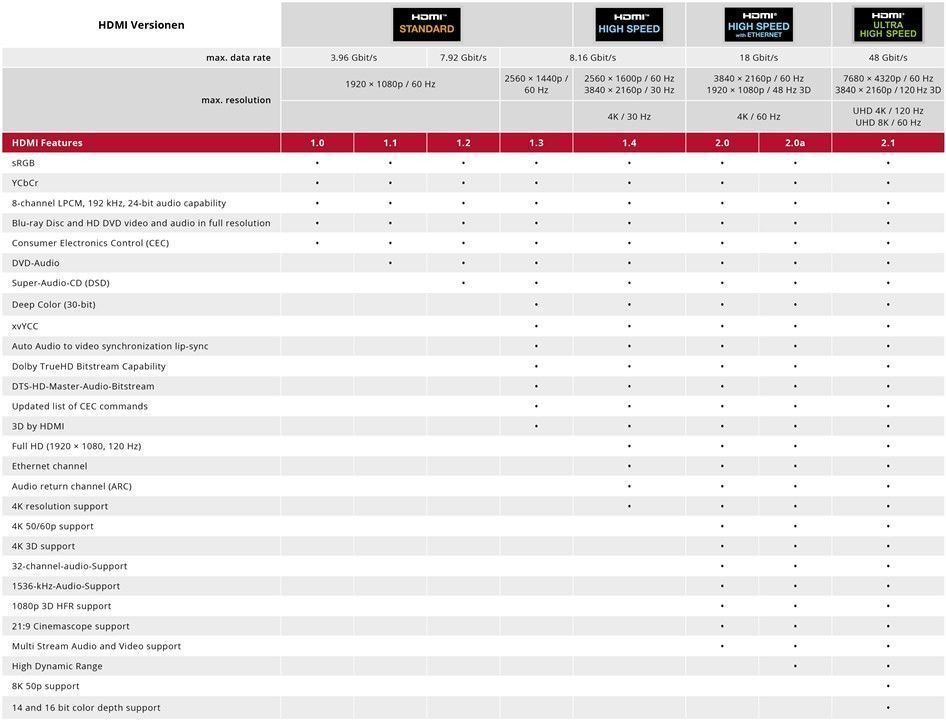 Poniższa tabela pokazuje różnice w standardach HDMI: